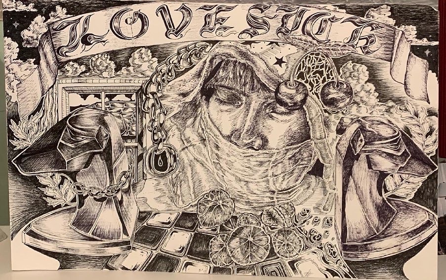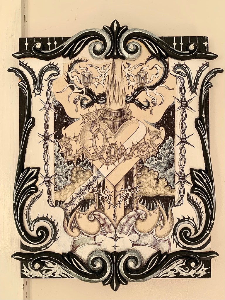 “Thorns of Love” 9×16 inches, ink and acrylic on wooden board, 2023