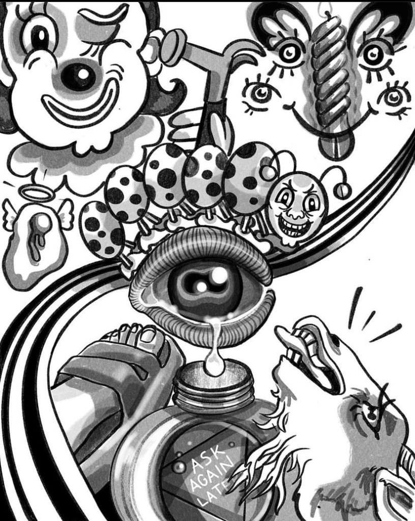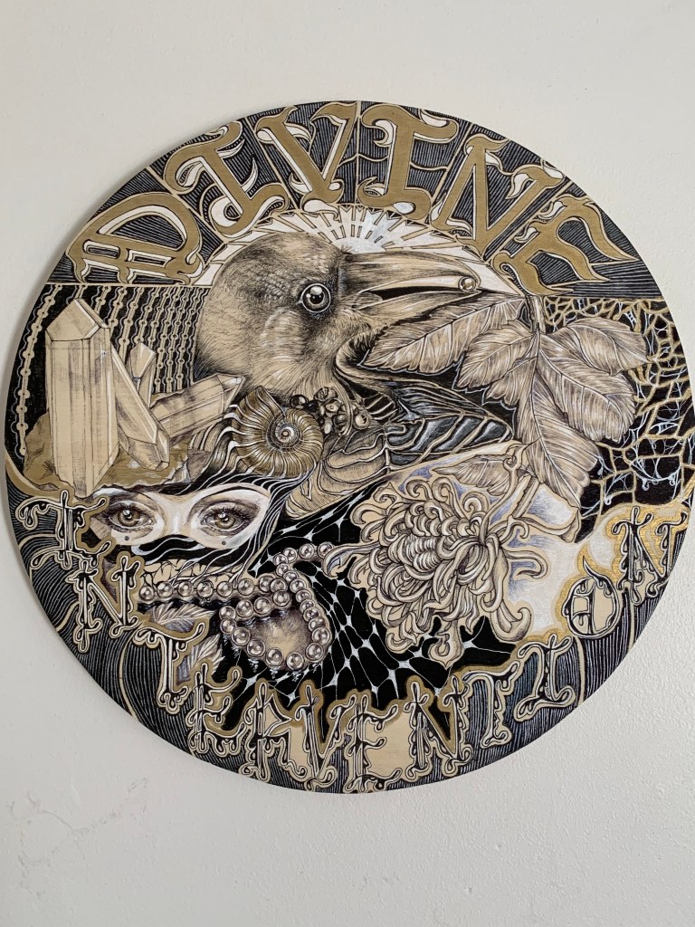 “Divine Intervention” 18 inch round, ink and acrylic on wooden board, 2023