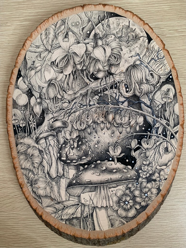 “Midnight Garden” 12 inch round, ink on wood, 2022